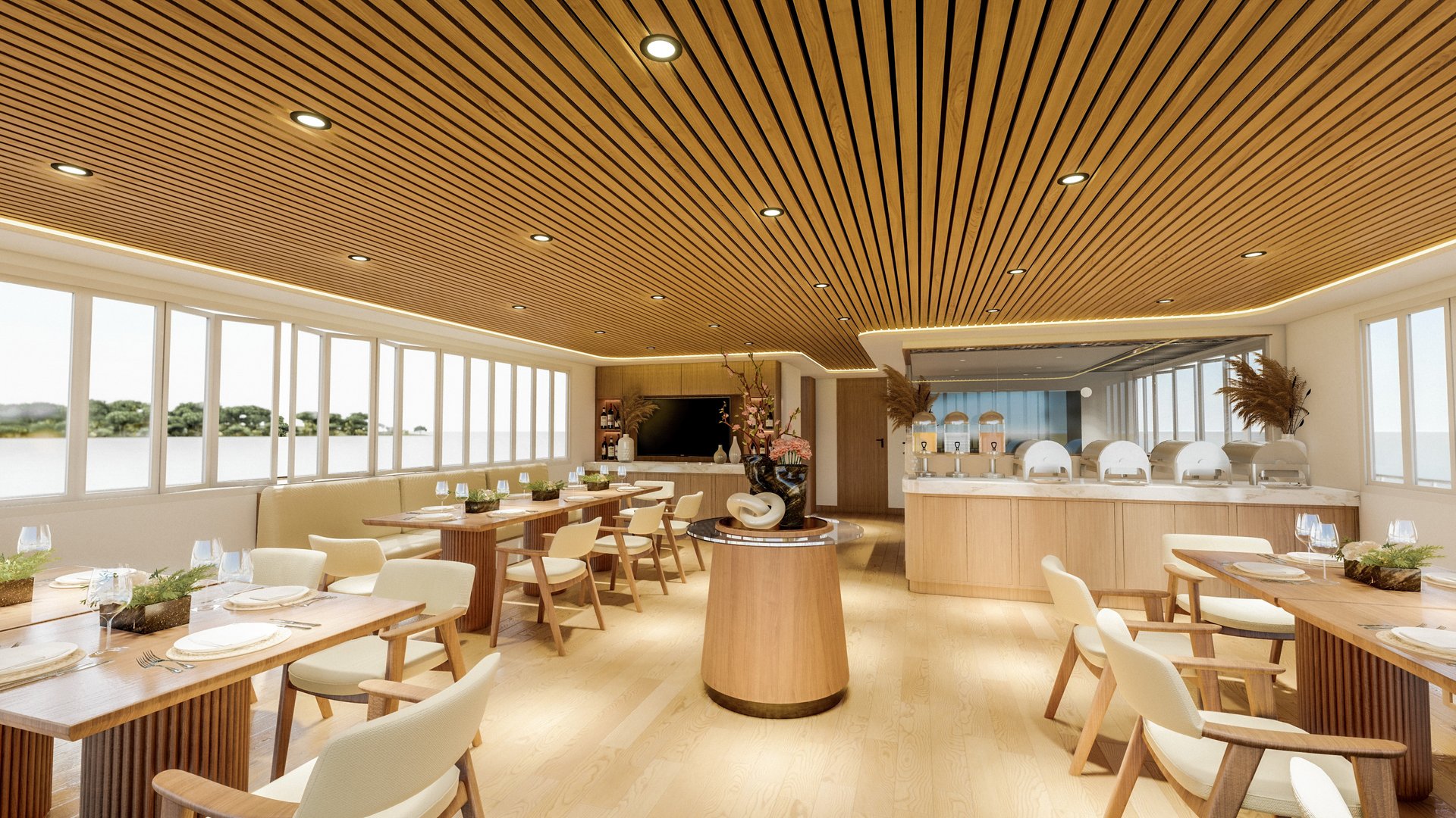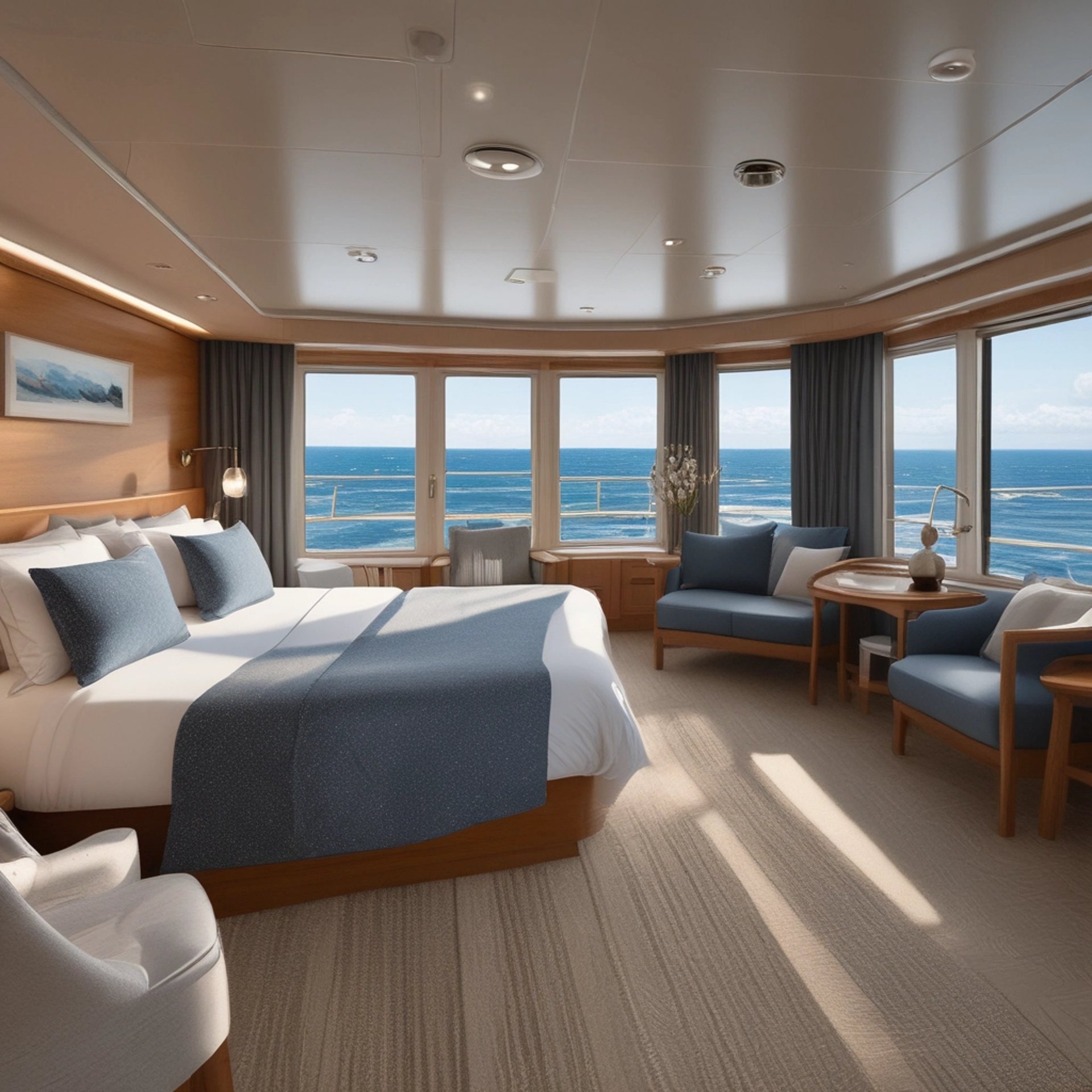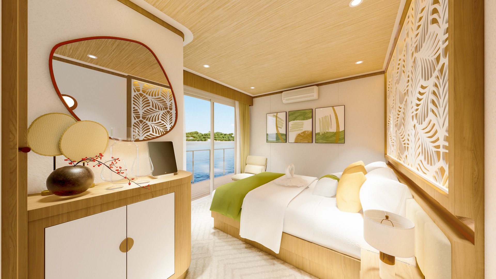 The spacious bridge-level Premium suite has panoramic views out to sea. All upper deck cabins feature access to their own private balcony. With just 20 guests and 16 crew, spread across 4 decks, you have the ultimate in space, privacy and relaxation.